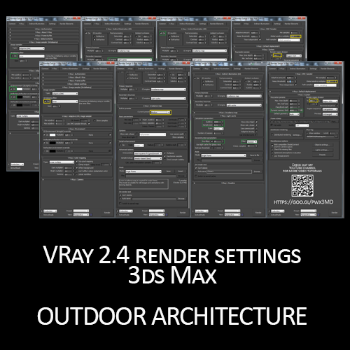 V-Ray 2.4 settings for outdoor architecture render in 3ds Max. Settings for Preview renders, Medium Quality and High Quality renders.